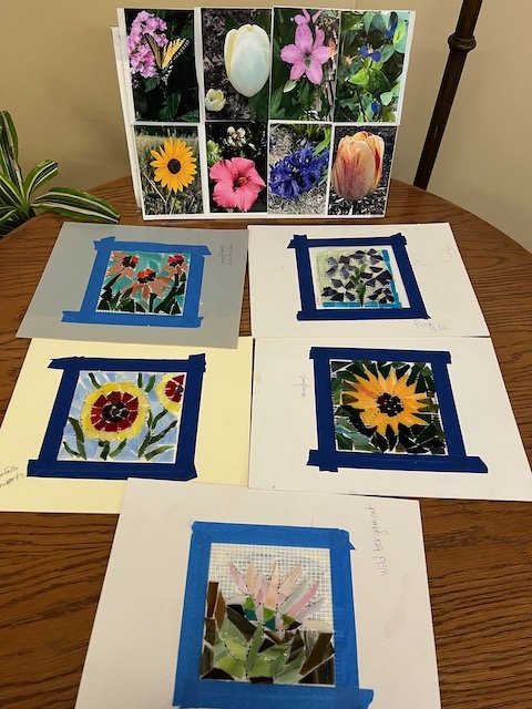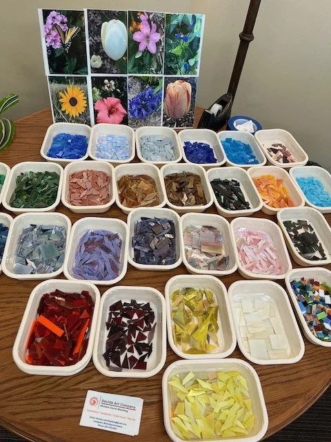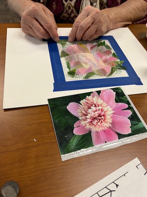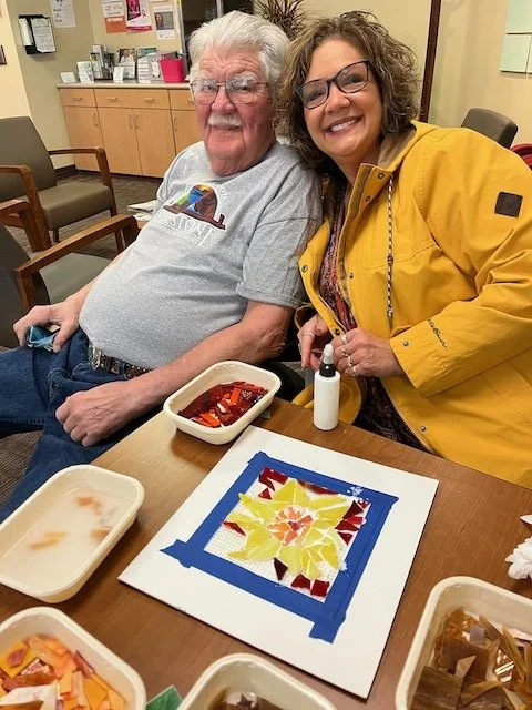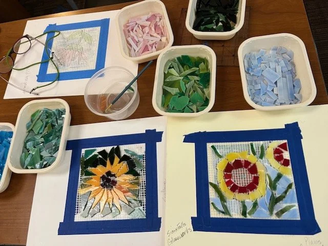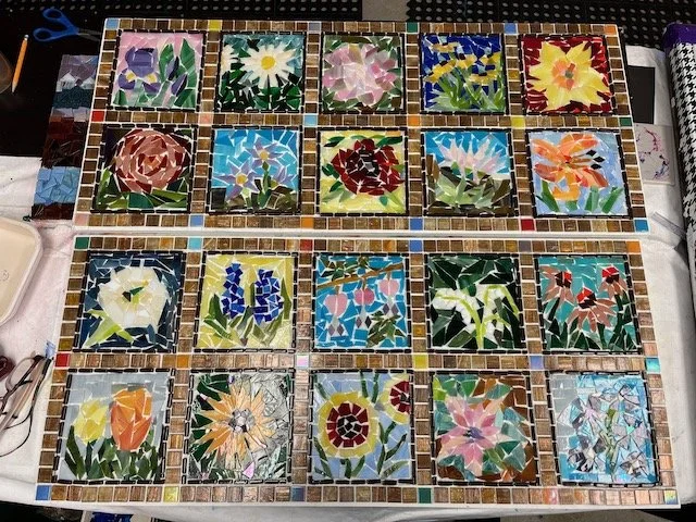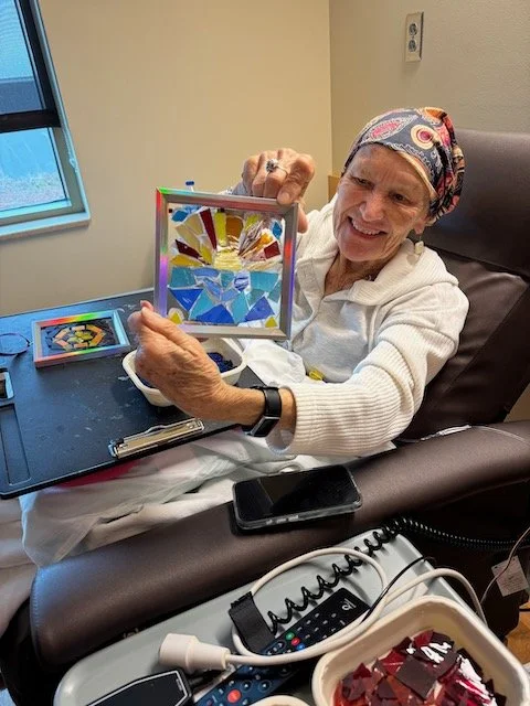 The evolution of this powerful mosaic collaboration entitled “Flowers of the Prairie” is astonishing and now hangs in the Avera Cancer Institute at the Avera Prairie Center on the Avera McKennan Hospital campus in Sioux Falls. Patients, staff, caregivers, and family members were encouraged to join me in creating a piece of the collaborative mosaic using pieces of stained glass, glued onto mesh, while they waited to receive treatments. We could escape together in this colorful, poignant public art piece.