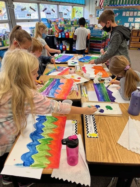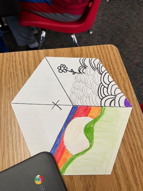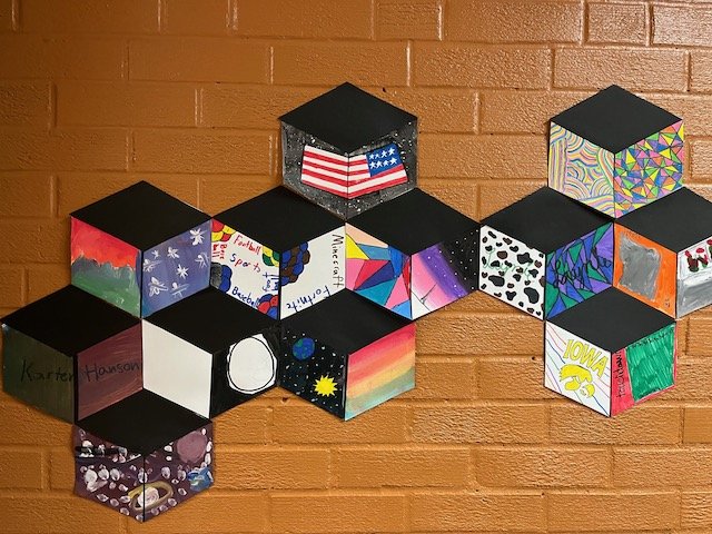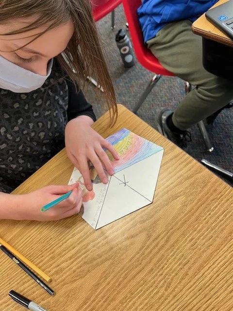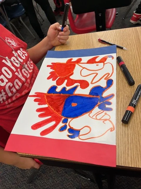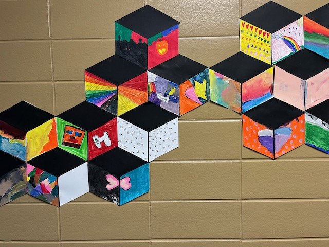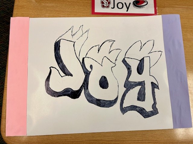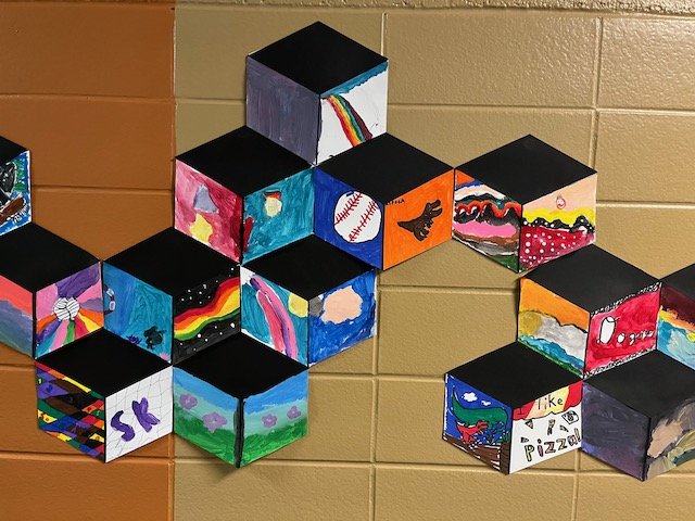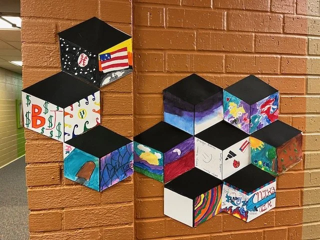 The way you tell your story can make all the difference! Graffiti, once considered pure vandalism, has gained recognition as an expressive art form that kids love to emulate when they have permission. During this residency, our focus was on creating a folder with a personal tag, or signature, using lettering, bold lines, and bright colors. Inspired by the work of street artist “Thankyou X”, our final project was a mural with each student visually telling their story on paper cubes that ultimately fit together.